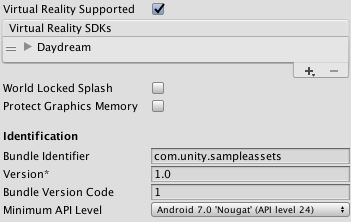 5、In Build Settings > Player Settings >Other Settings select: 虚拟现实支持和从下拉列表中选择Daydream。确保你在最低API级别中选择Android 7.0(或更高)否则Daydream将不会显示,你会得到一些关于manifest文件的错误! 如下截图所示: