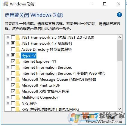 4、勾选Hyper-V 选项,然后确定,这个就是我们要安装的虚拟机功能了。