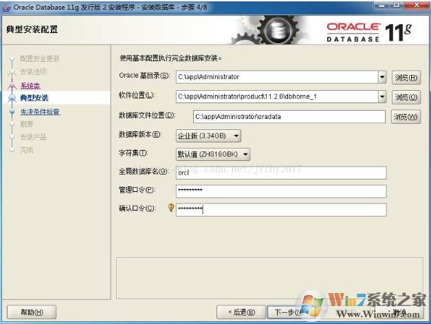 6、在“典型安装”窗口中,选择Oracle的基目录,选择“企业版”和“默认值”并输入统一的密码为:Oracle11g,单击“下一步”: