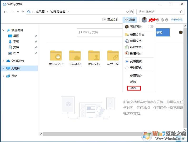 1、双击WPS云文档,然后登录,这时点击,菜单—设置;