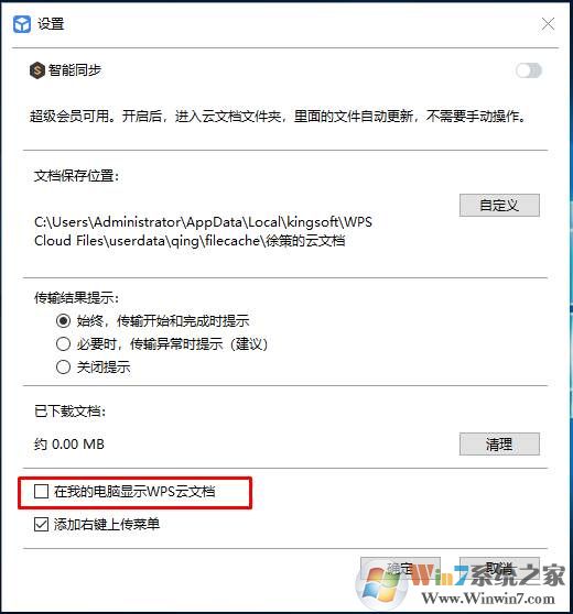 2、然后在下面 取消勾选 在我的电脑显示WPS云文档确定即可。