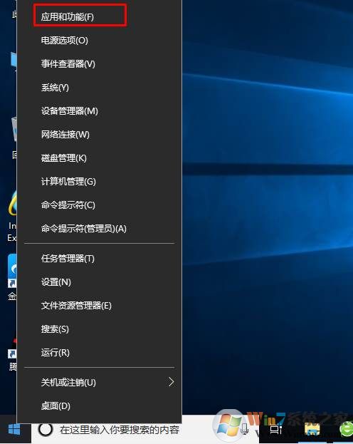1、右键点击开始菜单,然后点击“应用和功能”(如果是旧版的Win10 会打开旧板的控制面板,新版Win10已经取消)