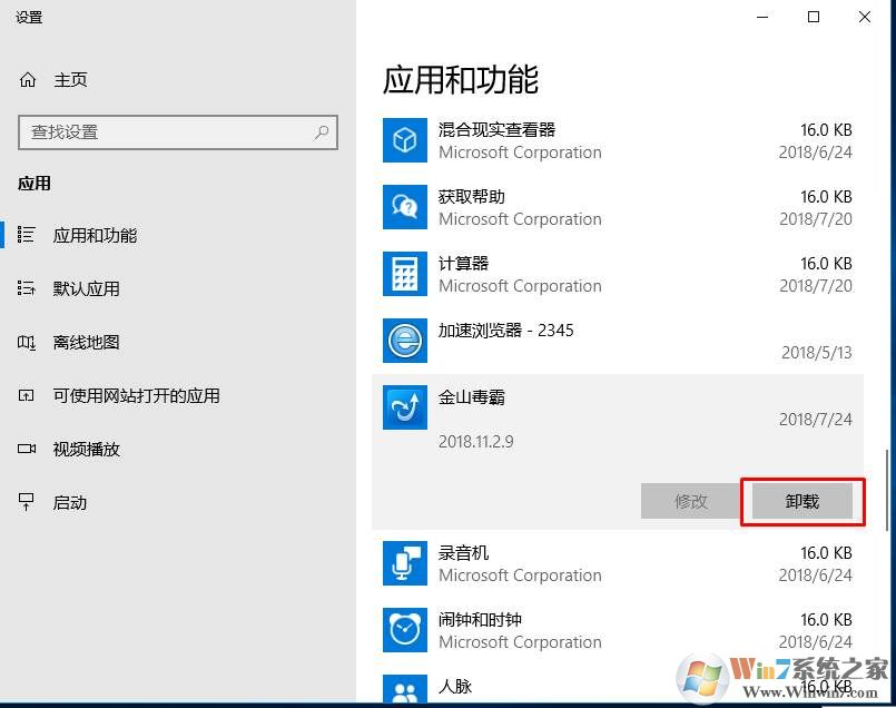 2、然后在应用列表里,找到金山毒霸,然后点击卸载;