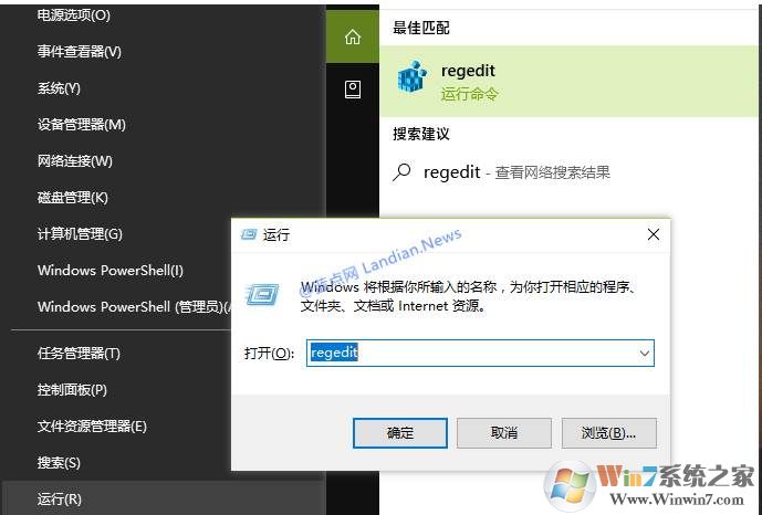 1、打开注册表编辑器:右键点击开始菜单然后选择运行并输入regedit点击确定,或直接在小娜的搜索框输入regedit也可找到: