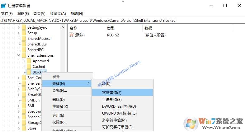 5、接着再把鼠标放到我们新建的Blocked上点击右键然后新建—>字符串值,字符串值的名称设置为: