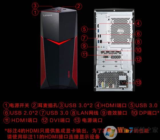 如下图,联想的一款高性能台机,同时有集成显卡(HDMI接口)和独立显卡(DVI+HDMI接口),如果显示器和集成显卡连接,那么只会使用集成显卡来工作。