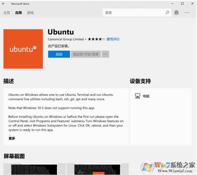 应用商店,搜索Ubntu 然后安装(下图已经安装显示启动)