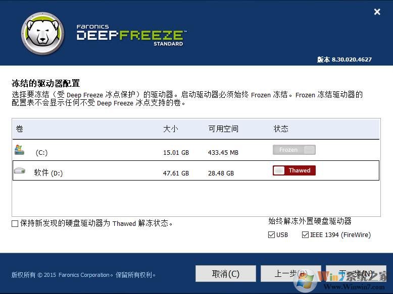 4、选择要保护的(冻结)的磁盘分区,下图,C盘为冻结,D盘不冻结;