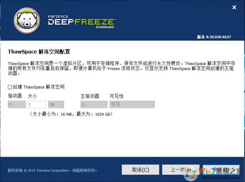 5、冰点还原精灵提供了创建一个解冻空间的功能,可以创建一个分区始终为不冻结状态,方便用户保存更改,下载文件,存放文件,在重启后也能保留;(如不需要不创建)