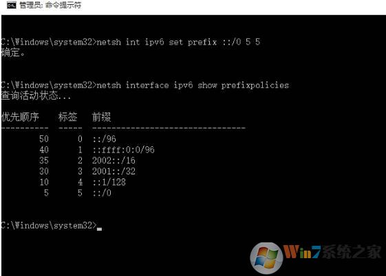 2.输入命令 netsh interface ipv6 show prefixpolicies,查询ipv6优先级