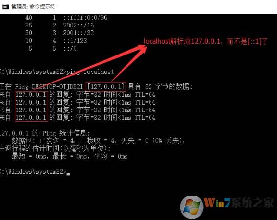5、可以看到,此时:: / 96,:: ffff:0:0/96优先级高于::/0了。ping一下localhost,