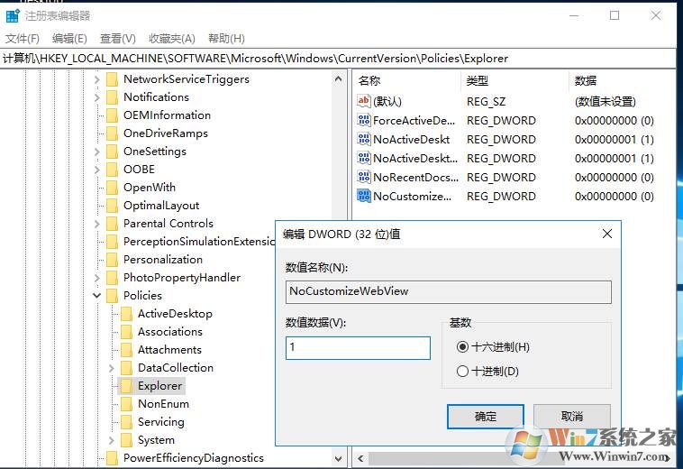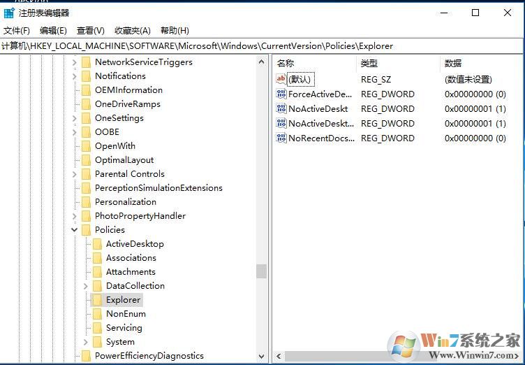 2、打开注册表之后找到以下路径:HKEY_LOCAL_MACHINE\SOFTWARE\Microsoft\Windows\CurrentVersion\Policies\Explorer 如下图