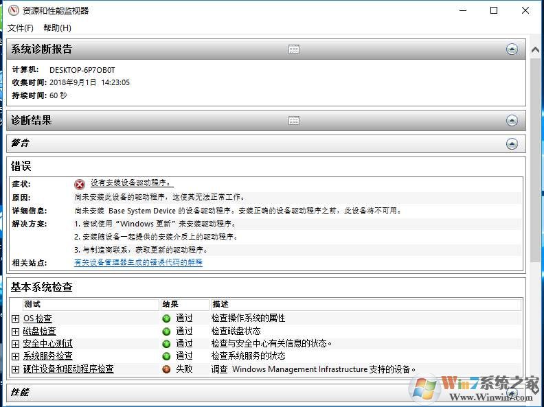 3、等待这个过程结束后,会给予我们完整的系统诊断报告,各种检查结果(系统检查、磁盘检查、安全中心测试、系统服务检查、硬件设备和驱动程序检查),硬件和软件要是有什么问题的话,从结果就可能看到了。