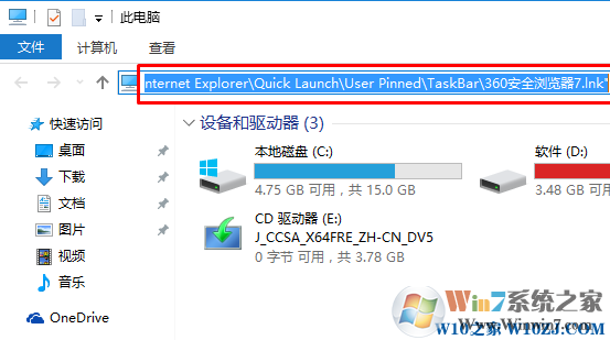 3、要打开文件夹,我们可以去除复制路径两边的引号,然后把如:360安装浏览器7.lnk 去除,回车就可以进入了。