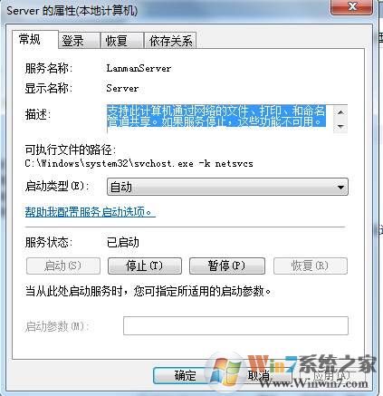 支持此计算机通过网络的文件、打印、和命名管道共享。如果服务停止,这些功能不可用。如果服务被禁用,任何直接依赖于此服务的服务将无法启动。