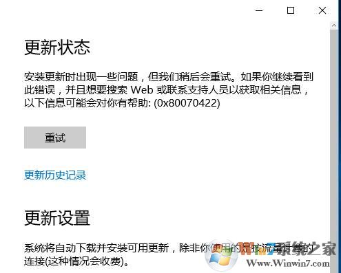 最近有用户反馈在Win10系统的更新处,点击查找更新进行手动更新的时候出来更新状态 0x80070422的错误提示,重试也没有用,相信很多朋友都有遇到过,其实这是由于一些用户把自动更新服务禁用了导致的,下面有解决方法,大家可以按步骤设置一下。