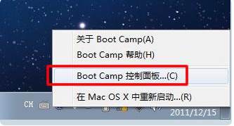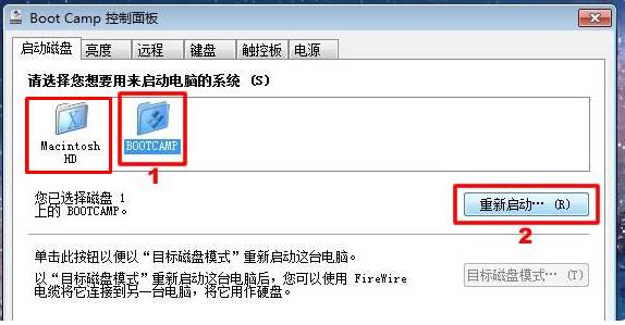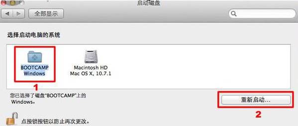 windows10系统下打开BootCamp(右下角灰色的小图标,可能隐藏在小三角里了),在启动磁盘选项里选择启动电脑的系统为Mac OS X,然后点重新启动键。(下图为Win7的,但是Win10也是一样的哦)