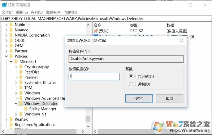 在右侧新建名为“DisableAntiSpyware”的DWORD(32位)值,并将其数值数据修改成1。