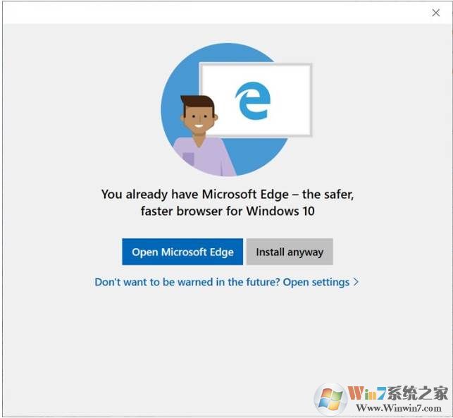 在最新的预览版中,微软为了推荐用户使用Edge浏览器,可谓是煞费苦心了。有推特网友反映,在安装其他浏览器的时候,系统会弹出窗口,提示Edge浏览器是“为Windows设计的更快,更安全的浏览器”。这一窗口提供了两个按钮,一个亮蓝色的按钮为启动Edge,一个灰色按钮则显示“仍然安装”。