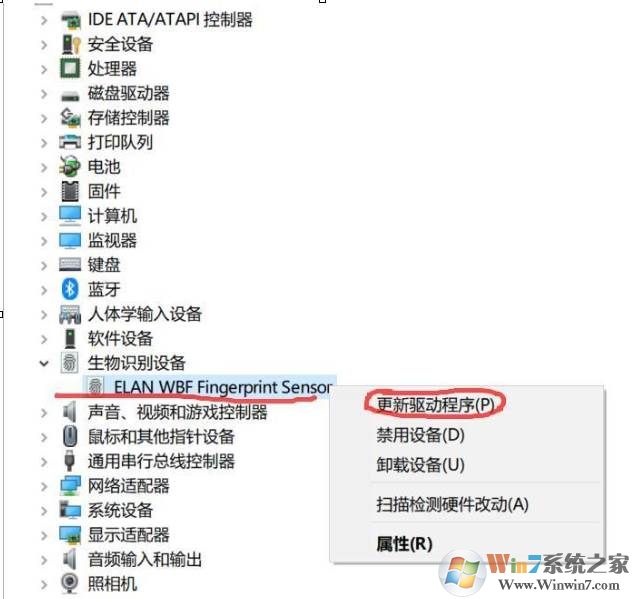 1、右键点击我的电脑-属性-设备管理器-:找到生物识别设备,然后右键 更新驱动驱动程序;