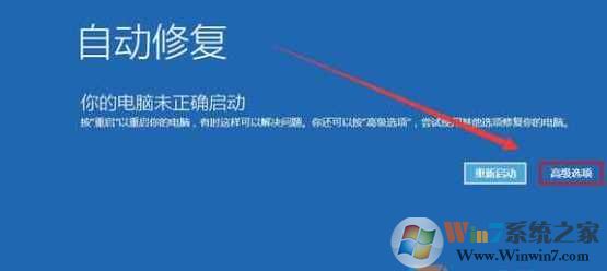 重复步骤3次左右启动后出现“自动修复”界面,我们点击 高级选项 进入;