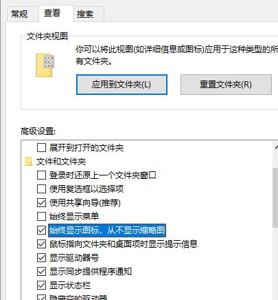 2、点击“查看”选项卡,查找“高级设置”列表下“文件和文件夹”分组中的“始终显示图标,从不显示缩略图”选项,选中该项并点击“应用”并确定即可。