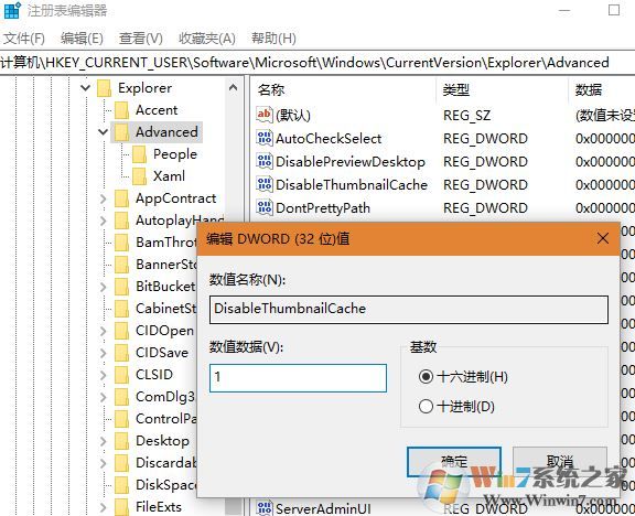 此外我们还可以通过按下Win+R并运行REGEDIT命令,启动注册表编辑器。依次导航到“HKEY_CURRENT_USER\Software\Microsoft\Windows\CurrentVersion\Explorer\Advanced”,找到右侧窗格中的DisableThumbnailCache项(若无则创建之);双击修改DisableThumbnailCache项的数值数据为1。退出注册表编辑器并重启文件资源管理即可,如图所示: