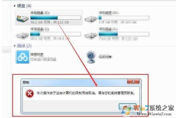 4、最后设置完成我们点击电脑C盘,将出现限制提示 C盘也就无法打开了。如图: