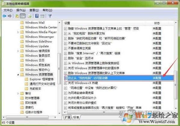 2、确定后弹出本地组策略编辑器,接着依次展开“用户配置→管理模板→windows组件→windows资源管理器”再接着有右侧找到“防止从我的电脑访问驱动器”,双击打开。如图: