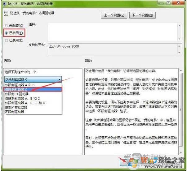 3、双击打开后,在新的窗口点击选择“已启用”。接着在选项栏下拉选择“仅限制驱动器C”。选择完成后,点击确定保存即可。如图: