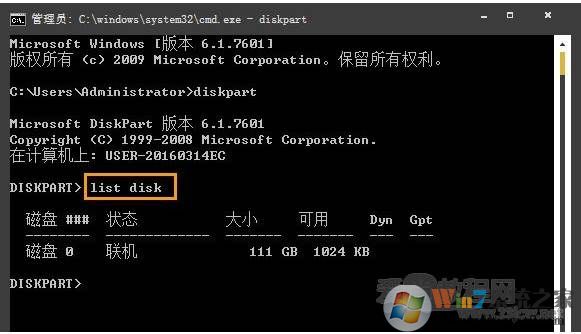 3、接着写入并执行list disk,也就是把电脑上的所有硬盘都罗列出来,图中只有一个硬盘,只显示磁盘0;