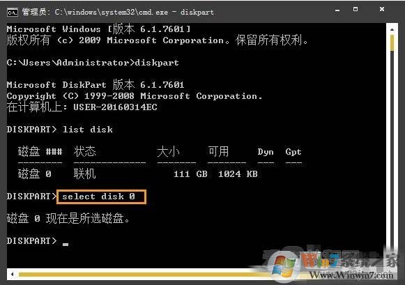 4、写入并执行select disk 0,选中磁盘;