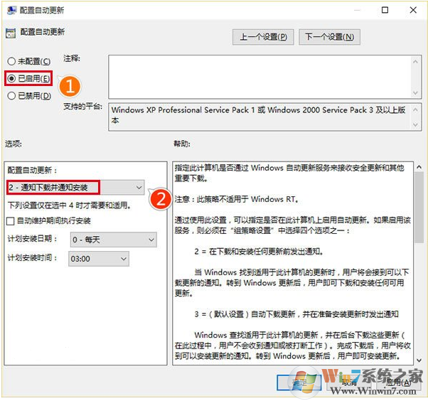 3、在右侧双击“配置自动更新”,然后选择“已启用”,在左下方下拉菜单中选择“2 - 通知下载并通知安装”后点击“确定”