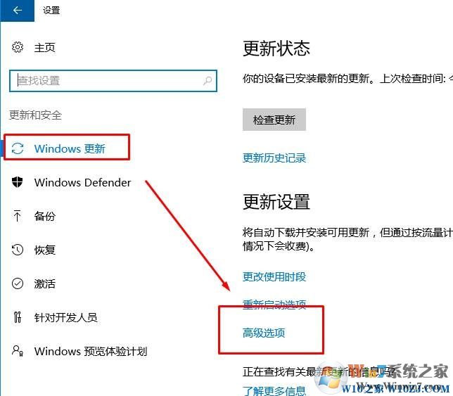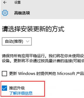 3、在高级选项界面勾选“推迟升级”选项即可。