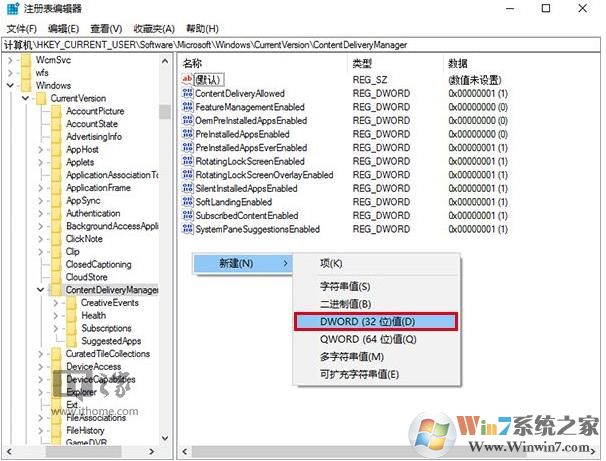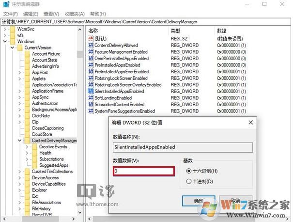 IT之家提示:如果没找到上面的值,可手动新建DWORD(32位)值,然后命名为SilentInstalledAppsEnabled,数值数据保持为默认的0即可(如上图)。