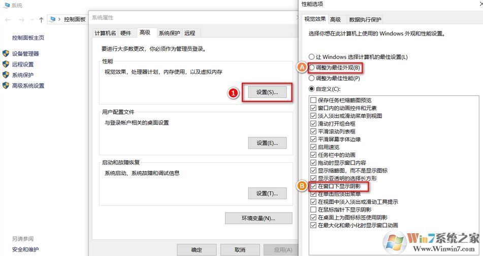 3、在打开“性能选项”对话框中勾选 A “调整为最佳外观”或者勾选 B “在窗口下显示阴影”设置均可还原 Windows 默认的窗口视觉效果。,如下图所示进行操作: