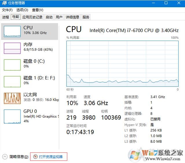 2、也可以通过 任务管理器,进入性能栏,最下方即资源监视器,如下图所示: