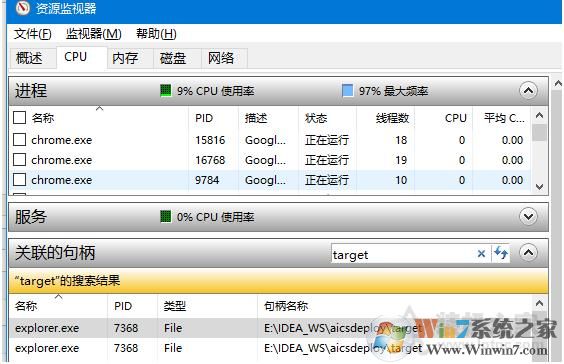3、然后在资源监视器中,CPU选项卡下,我们在关联句柄中输入你要删除的文件名,或部分关键词,搜索。就可以在句柄名称列找到被占用的文件(包括路径),对应行即占用进程信息,可以鼠标右键结束进程。