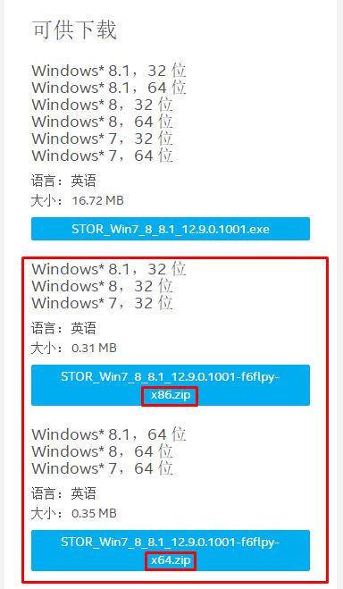2、打开后我们在左侧按自己当前系统的版本下载驱动,如下图所示,64位系统下载STOR_Win7_8_8.1_12.9.0.1001-f6flpy-x64.zip,32位系统就下载STOR_Win7_8_8.1_12.9.0.1001-f6flpy-x86.zip;