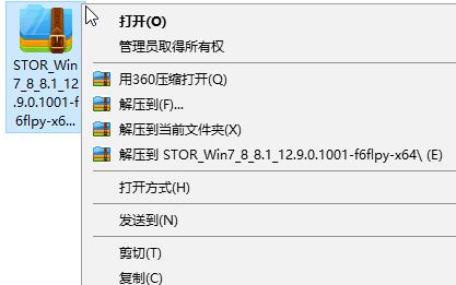 5、将下载之后的压缩包放到桌面或者比较好找的磁盘根目录下,单击右键,选择 解压到 STOR_Win7_8_8.1_12.9.0.1001-f6flpy-x64 ;