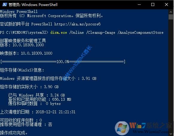 该命令除了可以检查WinSxS组件存储大小,还会推荐你是否使用组件存储清理。