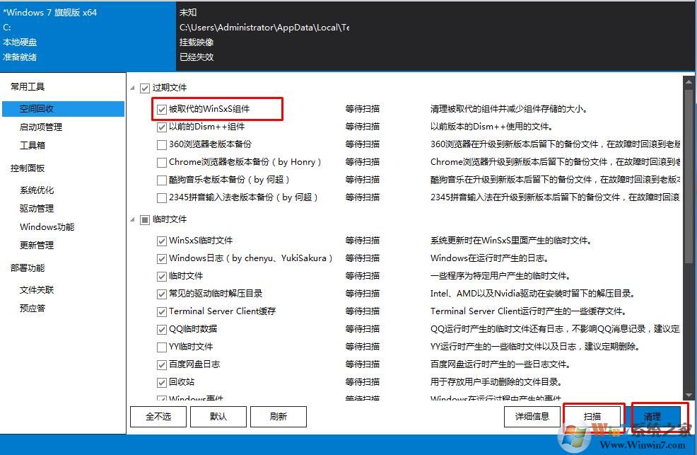2、打开之后选择空间回收,勾选被取代的WinSXS组件;