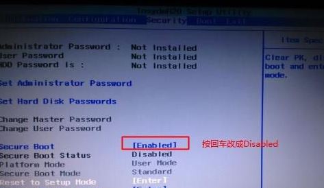 1、开机一直按F2或(FN+F2)进入BIOS,按→方向键切换到Security,选择Secure Boot回车设置成Disabled;