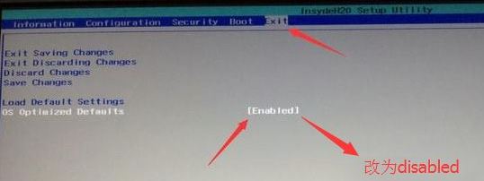 2、转到Exit,把OS Optimized Defaults设置为Disabled或Other OS