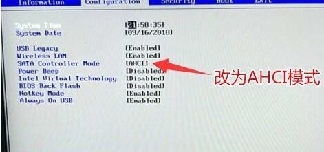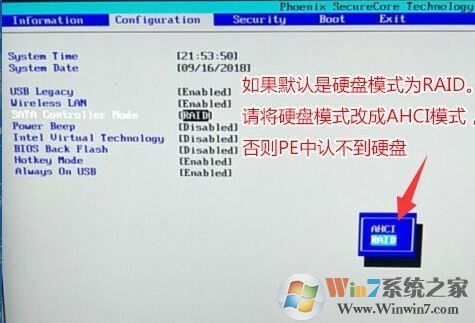 3、注意:再返回configuration这项,查看sata controller mode这项,如果默认硬盘模式为RAID,请将硬盘模式改为AHCI模式,否则进PE后不能认出硬盘,如下图所示;
