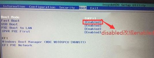 4、切换到Boot,把Fast Boot从Disabled改成Enabled,开启快速启动设置U盘启动,然后按F10保存,如下图所示;