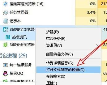 3、右键点击该进程,在弹出菜单中选择“打开文件所在的位置”菜单项,如图: