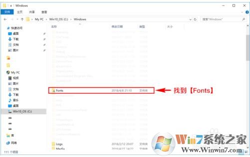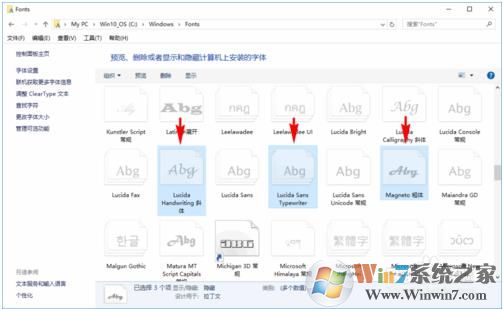 4、找到Fonts文件夹之后,我们点击进入,这个文件夹就是系统的字体文件夹,进入后,我们在里面找到之前在word字库中那些自己不想要的字体。
