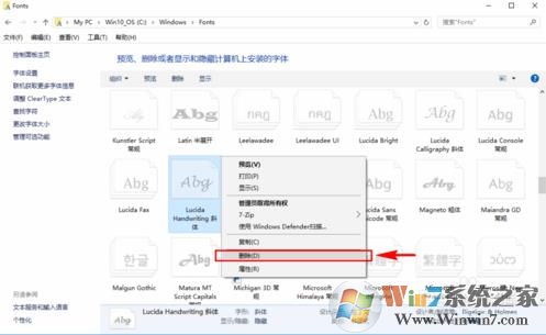 6、我们选中自己不想要的那一款字体,然后单击鼠标右键,可以先选择预览,查看当前选中的字体是不是自己不想要的字体,然后确定不想要选中的那一款字体了,我们在右键菜单里选择删除即可。