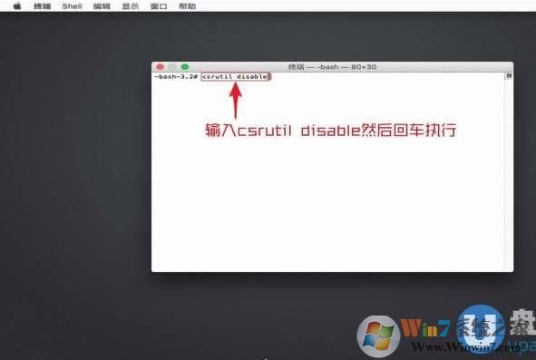 3、终端内输入命令:csrutil disable 然后回车执行,注意中间有个空格。